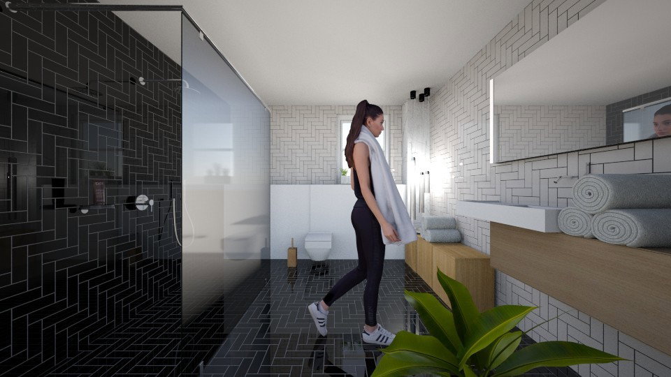 חדר רחצה דרמטי - בשחור ולבן עם נגיעות עץ