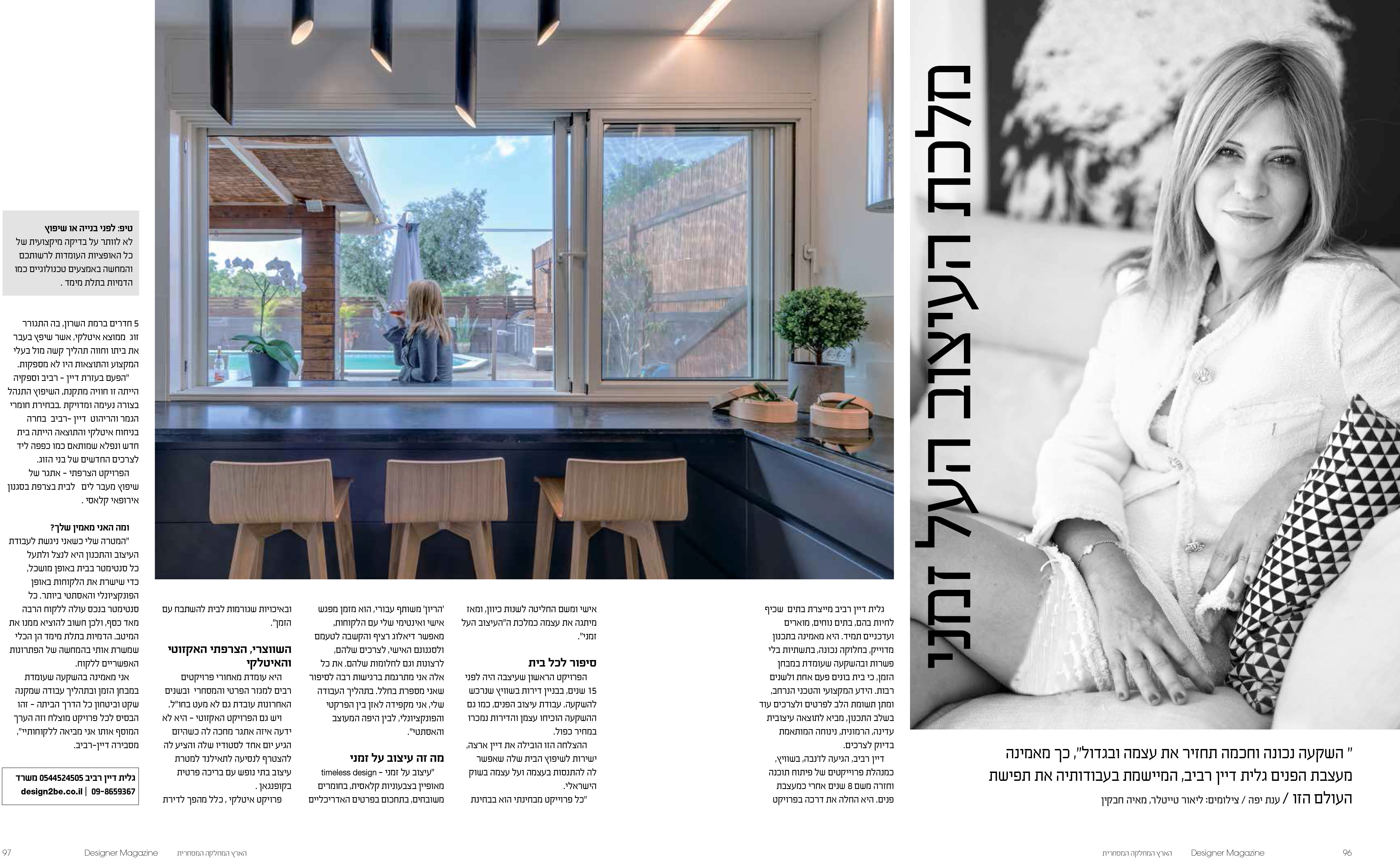 עיצוב פנים בית, או שיפוץ הבית נראה לעיתים כמו משימה קלה שכל אחד מאיתנו יכול לעשות בקלות, רק צריך לקרוא כמה דקות בפורומים של עיצוב. אך כשצוללים פנימה מבינים שמדובר במשימה מורכבת הדורשת ידע רב ומקצועיות. בדיוק בשביל זה, אתם מוזמנים לפנות אלינו, סטודיו גלית דיין רביב. הסטודיו שלנו עוסק בעיצוב פנים בתים כבר למעלה מ15 שנה. אצלנו תוכלו לקבל את כל הידע, המקצועיות והתשוקה שיהפכו את הבית שלכם לכל מה שתמיד חלמתם. עיצוב איכותי, קפדני ומהודק, כך שהתוצאה המתקבלת הינה עיצוב פנים בית על זמני שימשיך איתכם שנים קדימה.