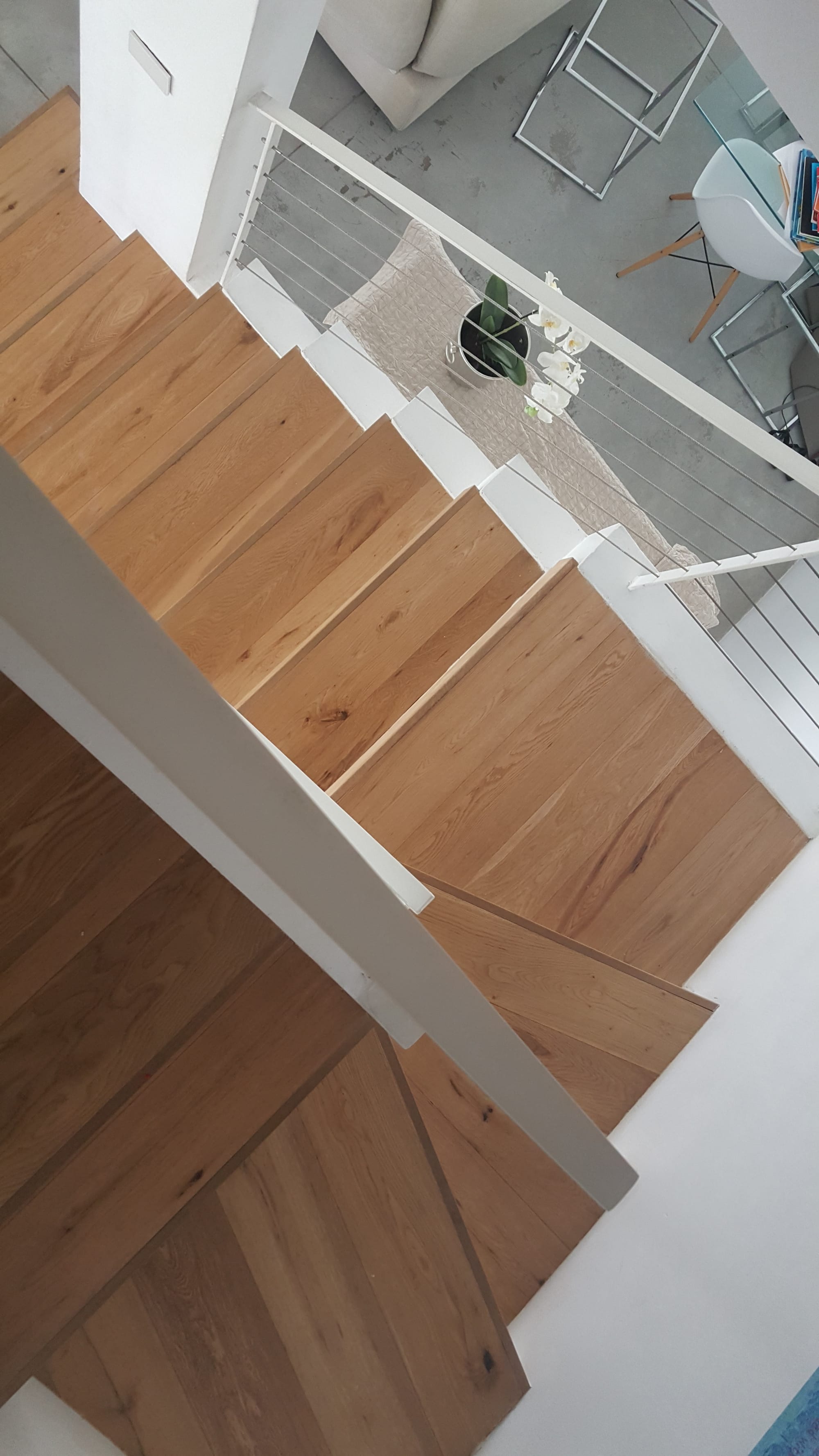 בחרנו בחומרים המשתלבים עם עיצוב הבית: מדרגות עץ כדוגמת הפרקט, מעקה ברזל מנימליסטי .