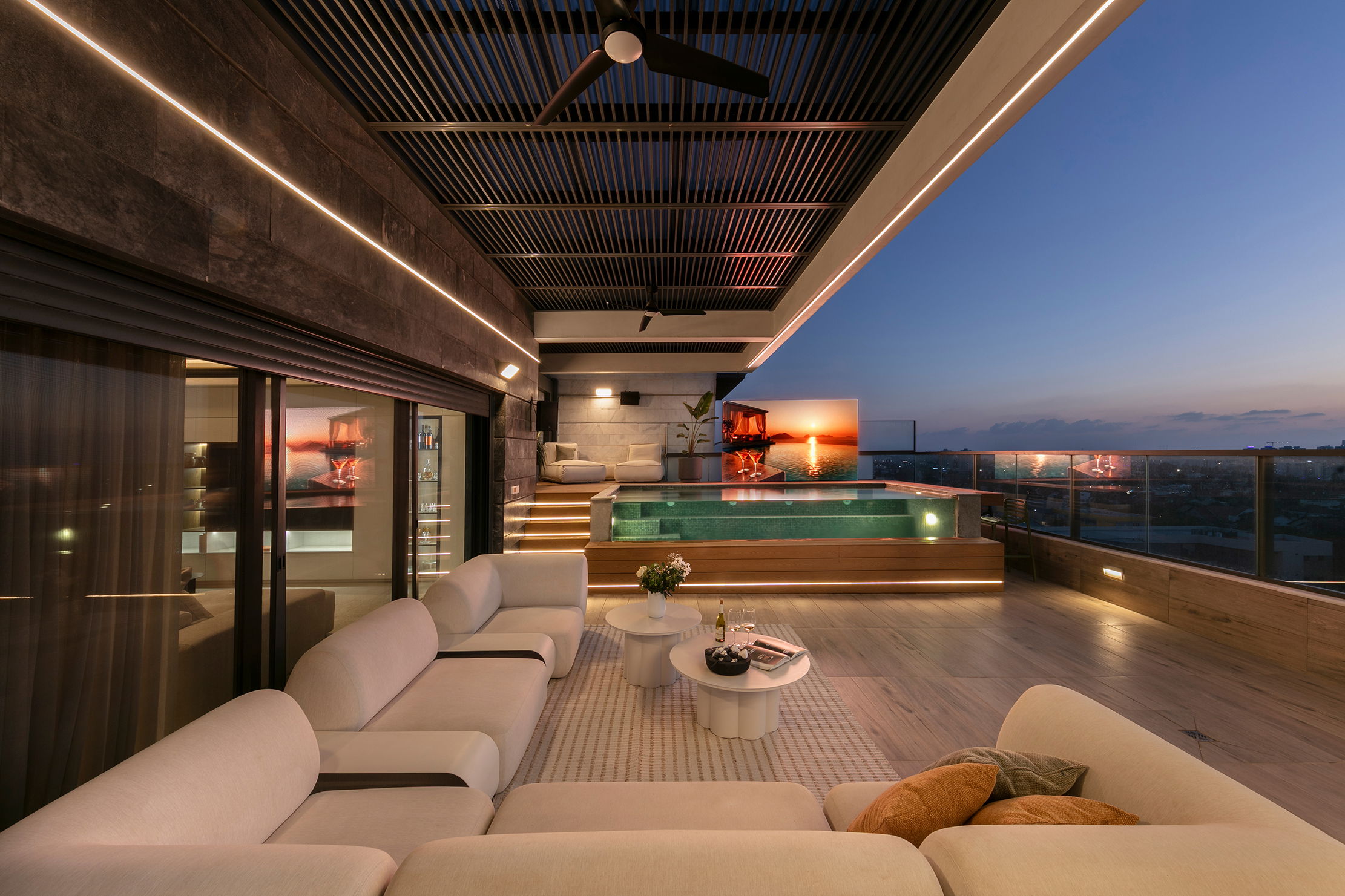 The design began with thinking about how we could see the pool from anywhere in the house – so we created open spaces, clean lines and a continuous connection between the inside and the outside. Instead of a TV, a giant LED screen stands above the pool, creating an unforgettable hospitality experience.